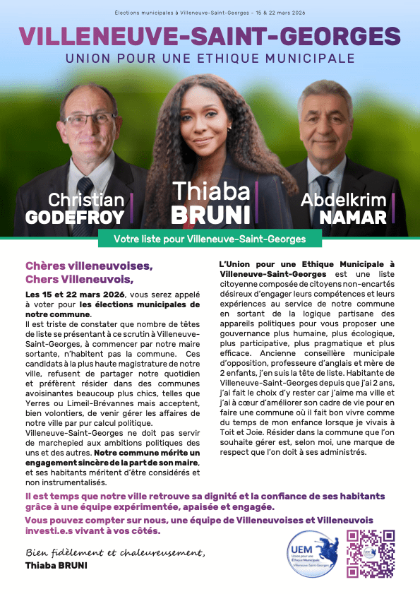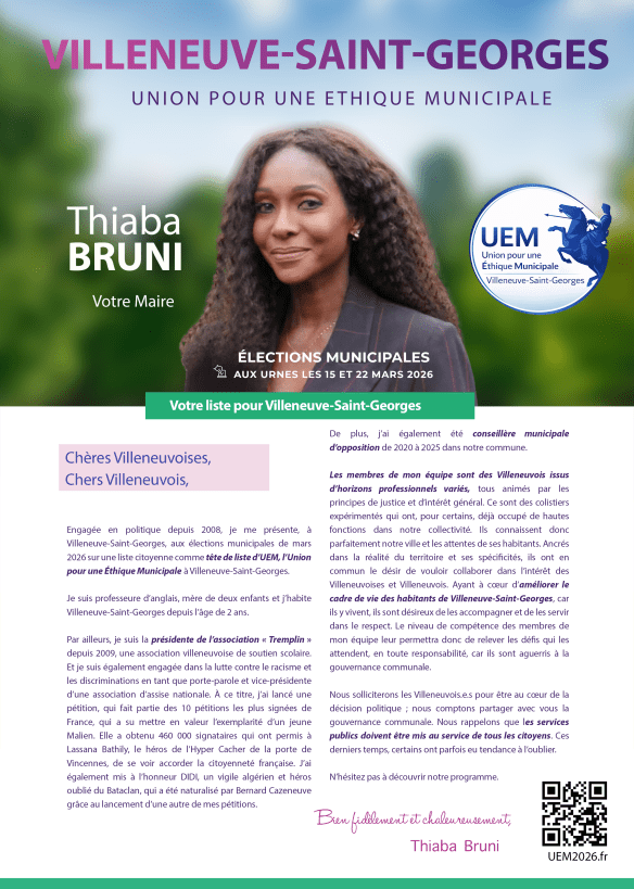 Engagée en politique depuis 2008, je me présente, à Villeneuve-Saint-Georges, aux élections municipales de mars 2026 sur une liste citoyenne comme tête de liste d’UEM, l’Union pour une Éthique Municipale à Villeneuve-Saint-Georges.