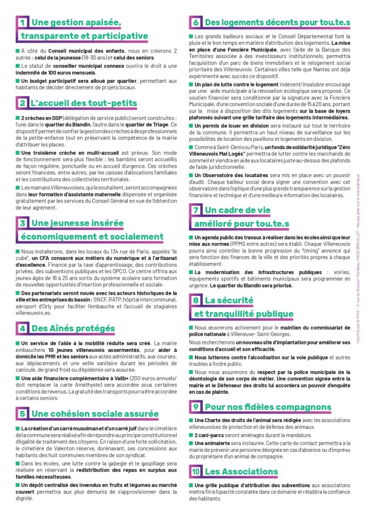 Nous solliciterons les Villeneuvois.e.s pour être au cœur de la décision politique ; nous comptons partager avec vous la gouvernance communale. Nous rappelons que les services publics doivent être mis au service de tous les citoyens. Ces derniers temps, certains ont parfois eu tendance à l’oublier.